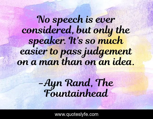 This page presents the quote "No speech is ever considered, but only the speaker. It's so much easier to pass judgement on a man than on an idea.". Author of this quote is Ayn Rand, The Fountainhead. This quote is about judgement, speech,.