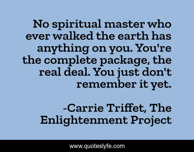 This page presents the quote "No spiritual master who ever walked the earth has anything on you. You're the complete package, the real deal. You just don't remember it yet.". Author of this quote is Carrie Triffet, The Enlightenment Project. This quote is about spirituality, acim, enlightenment, awakening,.