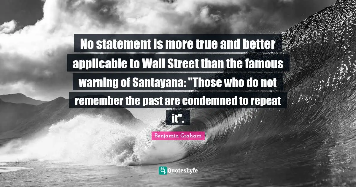 This page presents the quote "No statement is more true and better applicable to Wall Street than the famous warning of Santayana: "Those who do not remember the past are condemned to repeat it".". Author of this quote is Benjamin Graham. This quote is about remember, past, warning, wall, investing,.