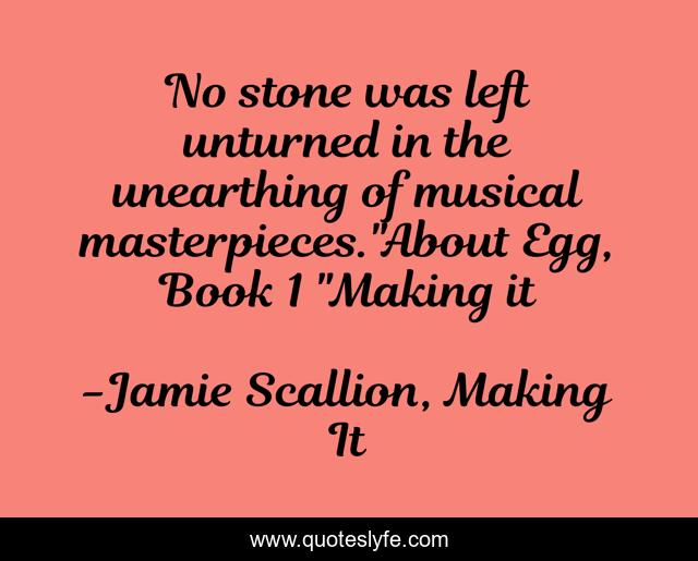 This page presents the quote "No stone was left unturned in the unearthing of musical masterpieces."About Egg, Book 1 "Making it". Author of this quote is Jamie Scallion, Making It. This quote is about young-adult-fiction, young-adult,.