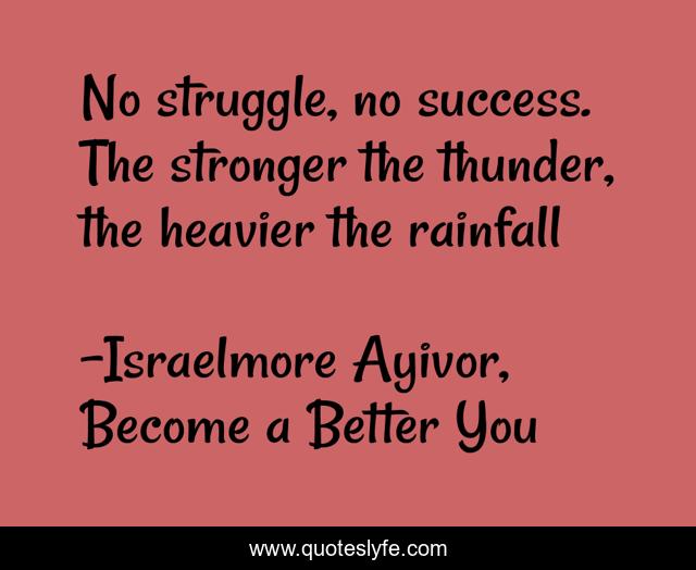 This page presents the quote "No struggle, no success. The stronger the thunder, the heavier the rainfall". Author of this quote is Israelmore Ayivor, Become a Better You. This quote is about inspirations, optimistic, showers, food-for-thought, thunder, struggles, be-strong, enthusiasm, heavier,.