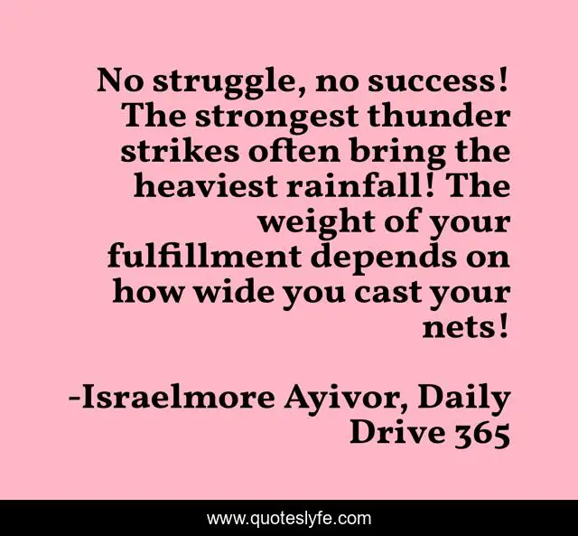 This page presents the quote "No struggle, no success! The strongest thunder strikes often bring the heaviest rainfall! The weight of your fulfillment depends on how wide you cast your nets!". Author of this quote is Israelmore Ayivor, Daily Drive 365. This quote is about heavy, weight, cast-your-net, heaviest, risk-taking, food-for-thought, strength, hard-work, thunder,.
