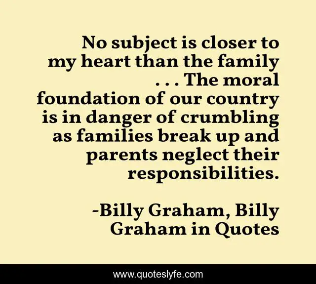 This page presents the quote "No subject is closer to my heart than the family . . . The moral foundation of our country is in danger of crumbling as families break up and parents neglect their responsibilities.". Author of this quote is Billy Graham, Billy Graham in Quotes. This quote is about family, billy-graham,.