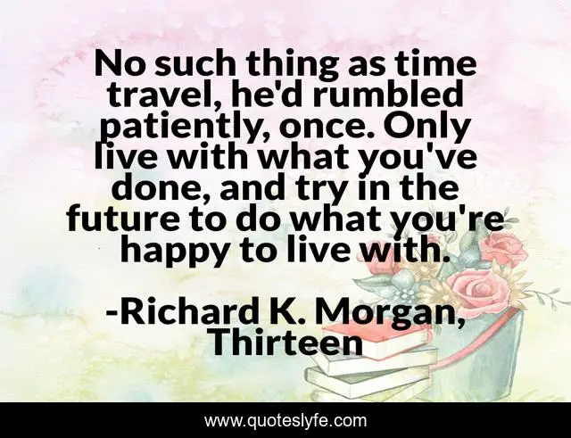 This page presents the quote "No such thing as time travel, he'd rumbled patiently, once. Only live with what you've done, and try in the future to do what you're happy to live with.". Author of this quote is Richard K. Morgan, Thirteen. This quote is about life, zen, regret,.