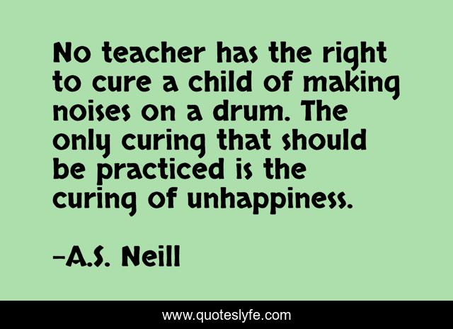 This page presents the quote "No teacher has the right to cure a child of making noises on a drum. The only curing that should be practiced is the curing of unhappiness.". Author of this quote is A.S. Neill. This quote is about alternative, school, childhood, summerhill, freedom, non-aggression-principle, free, choice, authoritarianism,.