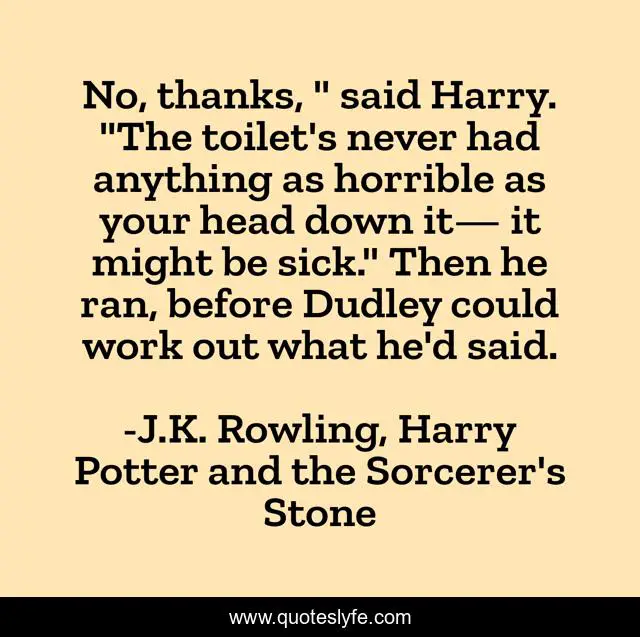 This page presents the quote "No, thanks, " said Harry. "The toilet's never had anything as horrible as your head down it— it might be sick." Then he ran, before Dudley could work out what he'd said.". Author of this quote is J.K. Rowling, Harry Potter and the Sorcerer's Stone. This quote is about dudley-dursley, toilet, humor, harry-potter,.