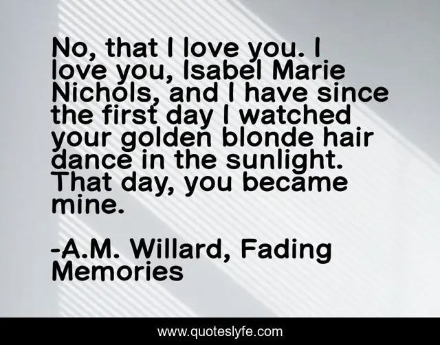 This page presents the quote "No, that I love you. I love you, Isabel Marie Nichols, and I have since the first day I watched your golden blonde hair dance in the sunlight. That day, you became mine.". Author of this quote is A.M. Willard, Fading Memories. This quote is about romance, enthusiasm, inspirational,.