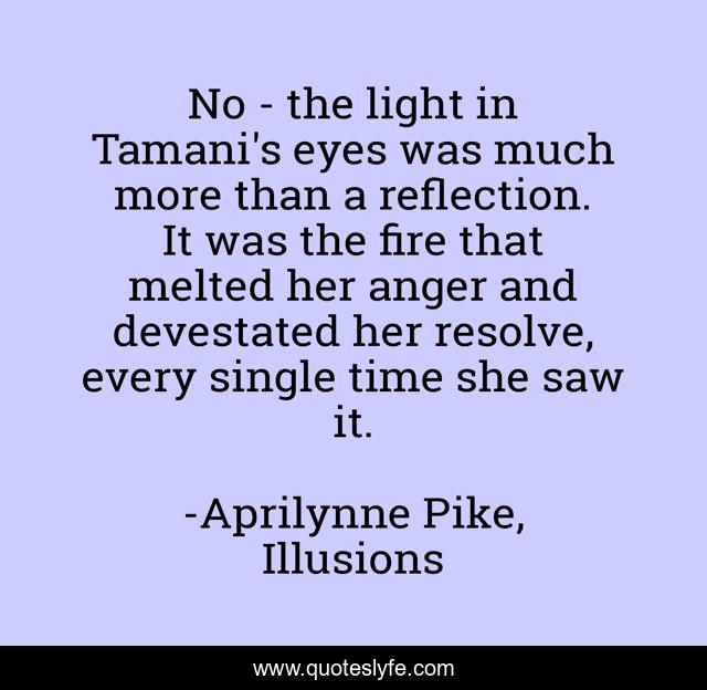 This page presents the quote "No - the light in Tamani's eyes was much more than a reflection. It was the fire that melted her anger and devestated her resolve, every single time she saw it.". Author of this quote is Aprilynne Pike, Illusions. This quote is about fire, light, eyes, resolve, reflection,.