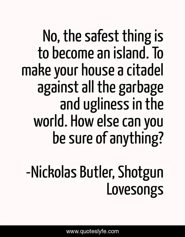 This page presents the quote "No, the safest thing is to become an island. To make your house a citadel against all the garbage and ugliness in the world. How else can you be sure of anything?". Author of this quote is Nickolas Butler, Shotgun Lovesongs. This quote is about home, life, safe, inspiration, island,.