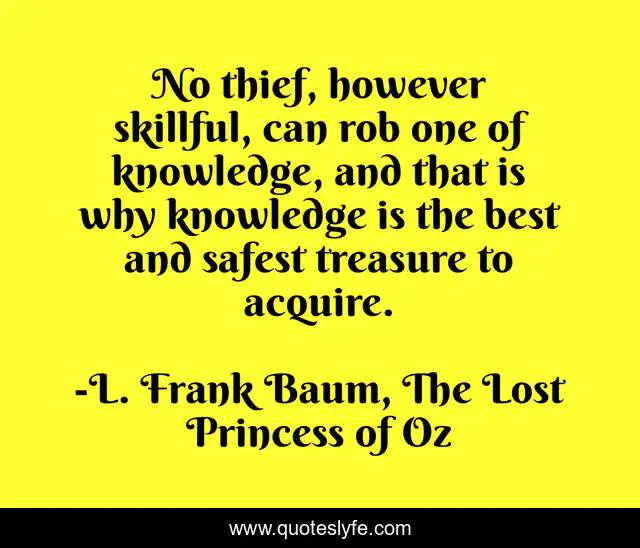 This page presents the quote "No thief, however skillful, can rob one of knowledge, and that is why knowledge is the best and safest treasure to acquire.". Author of this quote is L. Frank Baum, The Lost Princess of Oz. This quote is about treasure, knowledge, thievery,.