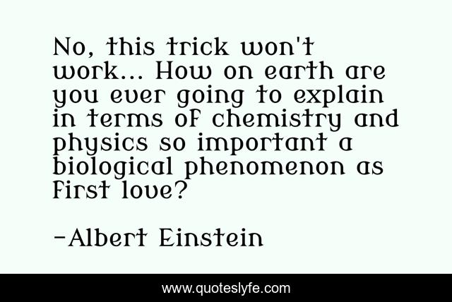 This page presents the quote "No, this trick won't work... How on earth are you ever going to explain in terms of chemistry and physics so important a biological phenomenon as first love?". Author of this quote is Albert Einstein. This quote is about love, chemistry, physics, first-love, affection,.