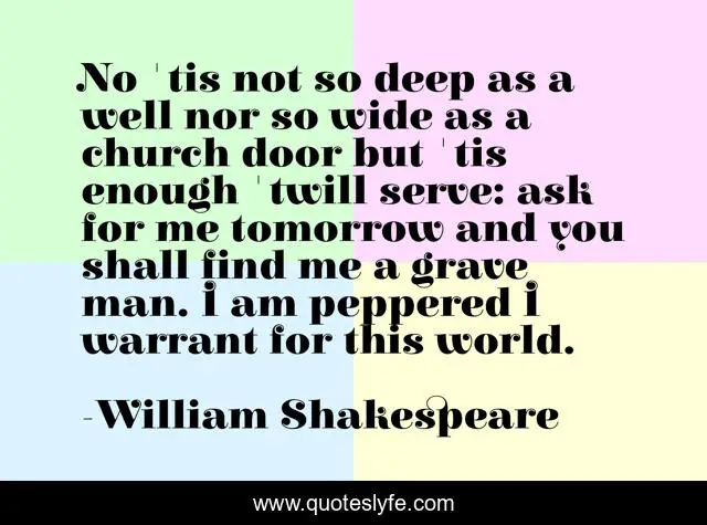 This page presents the quote "No 'tis not so deep as a well nor so wide as a church door but 'tis enough 'twill serve: ask for me tomorrow and you shall find me a grave man. I am peppered I warrant for this world.". Author of this quote is William Shakespeare. This quote is about death, dying,.