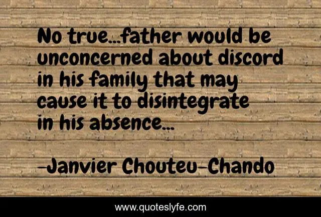 This page presents the quote "No true...father would be unconcerned about discord in his family that may cause it to disintegrate in his absence...". Author of this quote is Janvier Chouteu-Chando. This quote is about confidence, inspirational, positive, motivational, wisdom, parenthood, optimistic, fatherhood, enthusiasm,.