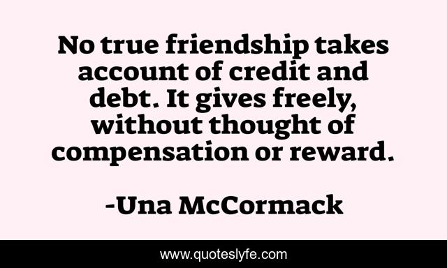 This page presents the quote "No true friendship takes account of credit and debt. It gives freely, without thought of compensation or reward.". Author of this quote is Una McCormack. This quote is about friends, friendship, inspirational, enthusiasm,.