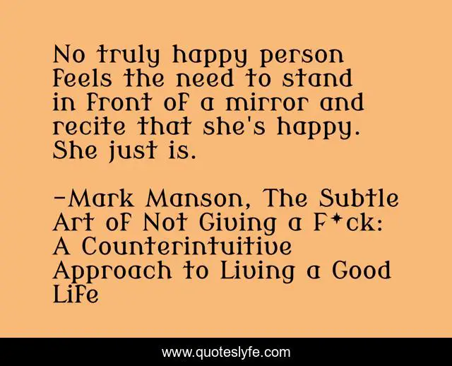 This page presents the quote "No truly happy person feels the need to stand in front of a mirror and recite that she's happy. She just is.". Author of this quote is Mark Manson, The Subtle Art of Not Giving a F*ck: A Counterintuitive Approach to Living a Good Life. This quote is about law-of-attraction, confidence, positive-thinking,.