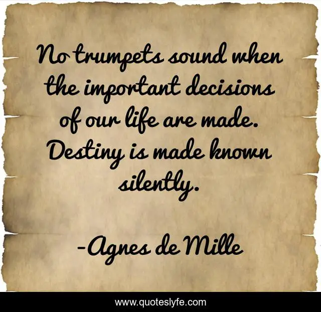 This page presents the quote "No trumpets sound when the important decisions of our life are made. Destiny is made known silently.". Author of this quote is Agnes de Mille. .