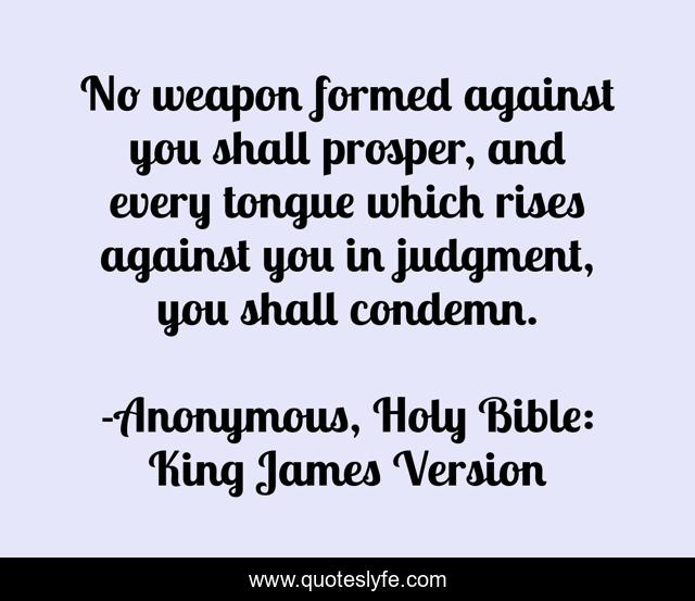 This page presents the quote "No weapon formed against you shall prosper, and every tongue which rises against you in judgment, you shall condemn.". Author of this quote is Anonymous, Holy Bible: King James Version. This quote is about bible, biblical,.