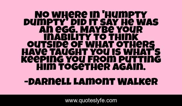 This page presents the quote "No where in 'humpty dumpty' did it say he was an egg. Maybe your inability to think outside of what others have taught you is what's keeping you from putting him together again.". Author of this quote is Darnell Lamont Walker. This quote is about life, humpty-dumpty, questions, children-story,.