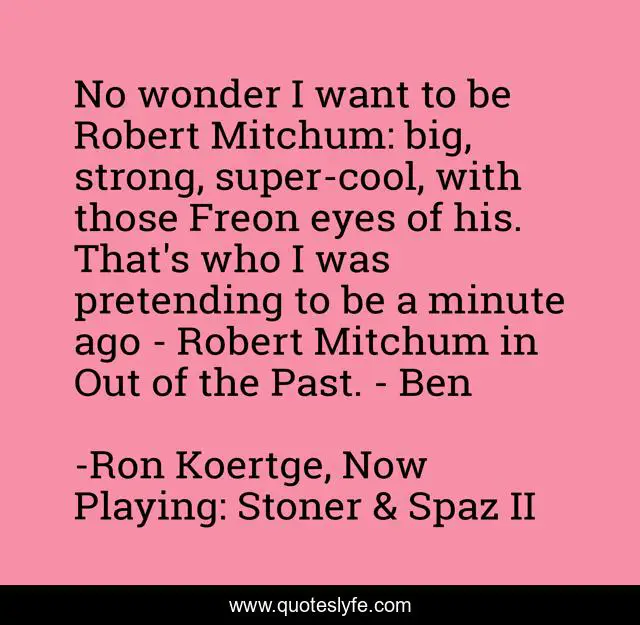This page presents the quote "No wonder I want to be Robert Mitchum: big, strong, super-cool, with those Freon eyes of his. That's who I was pretending to be a minute ago - Robert Mitchum in Out of the Past. - Ben". Author of this quote is Ron Koertge, Now Playing: Stoner & Spaz II. This quote is about robert-mitchum, teen, ya, ya-fiction, film-star, young-adult, dreams, inspiration,.