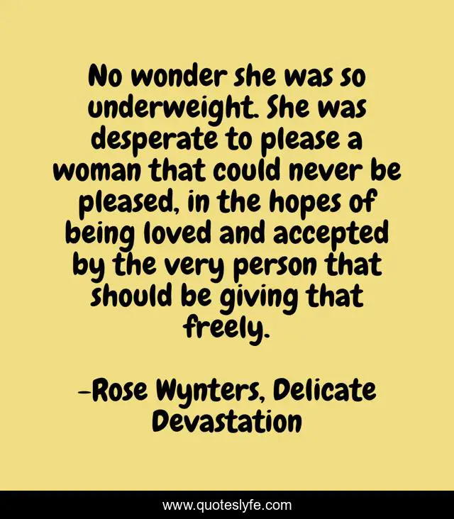 This page presents the quote "No wonder she was so underweight. She was desperate to please a woman that could never be pleased, in the hopes of being loved and accepted by the very person that should be giving that freely.". Author of this quote is Rose Wynters, Delicate Devastation. This quote is about self-esteem, weight-loss, weight, size,.