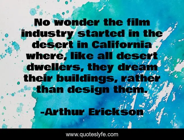 This page presents the quote "No wonder the film industry started in the desert in California where, like all desert dwellers, they dream their buildings, rather than design them.". Author of this quote is Arthur Erickson. This quote is about dream, desert, wonder,.
