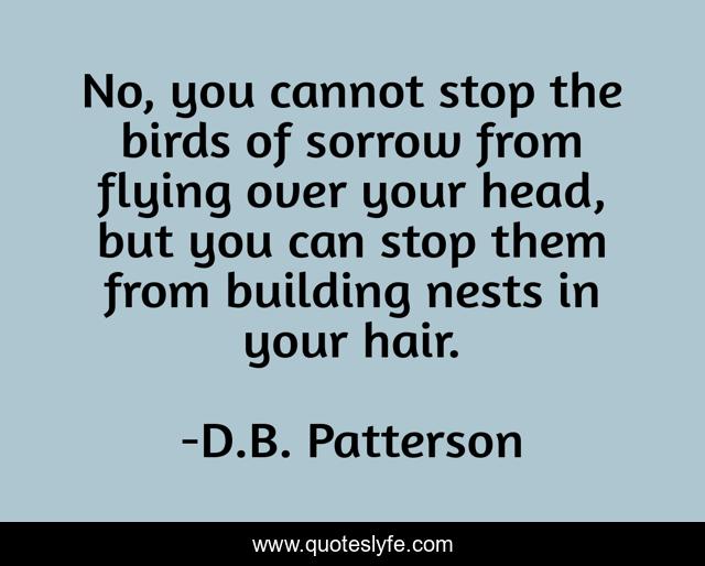 This page presents the quote "No, you cannot stop the birds of sorrow from flying over your head, but you can stop them from building nests in your hair.". Author of this quote is D.B. Patterson. This quote is about life-lesson, chinese-proverb, wisdom,.