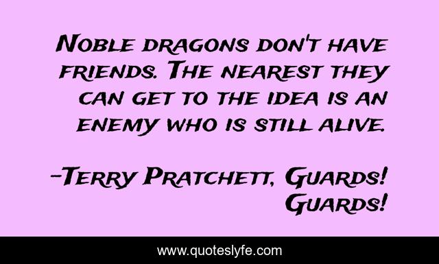 This page presents the quote "Noble dragons don't have friends. The nearest they can get to the idea is an enemy who is still alive.". Author of this quote is Terry Pratchett, Guards! Guards!. This quote is about friends, dragons,.