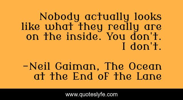 This page presents the quote "Nobody actually looks like what they really are on the inside. You don't. I don't.". Author of this quote is Neil Gaiman, The Ocean at the End of the Lane. This quote is about fiction-fantasy, fiction,.