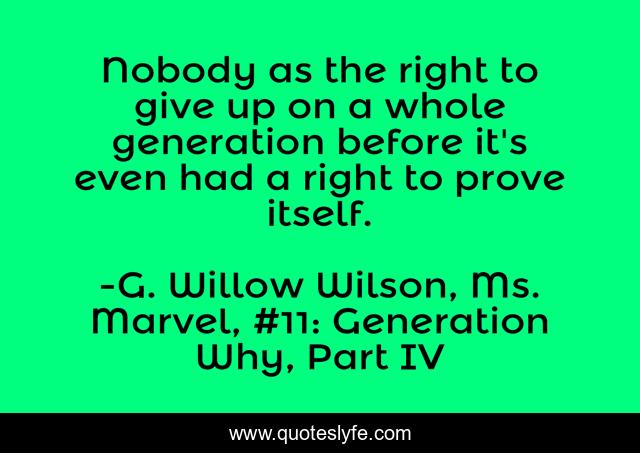 This page presents the quote "Nobody as the right to give up on a whole generation before it's even had a right to prove itself.". Author of this quote is G. Willow Wilson, Ms. Marvel, #11: Generation Why, Part IV. .