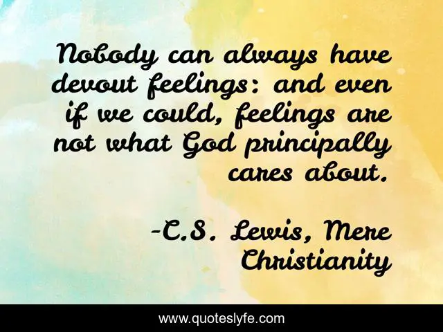 This page presents the quote "Nobody can always have devout feelings: and even if we could, feelings are not what God principally cares about.". Author of this quote is C.S. Lewis, Mere Christianity. This quote is about faith, devout, c-s-lewis, god, feelings,.