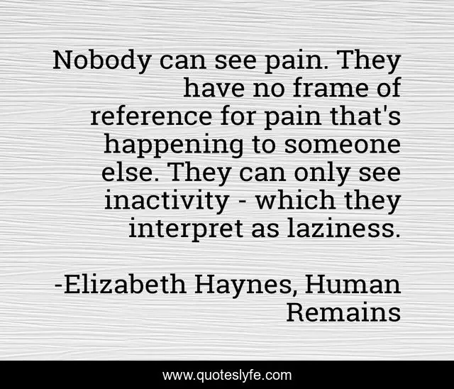 This page presents the quote "Nobody can see pain. They have no frame of reference for pain that's happening to someone else. They can only see inactivity - which they interpret as laziness.". Author of this quote is Elizabeth Haynes, Human Remains. This quote is about life, illness, pain, disability, mental-health, life-lessons,.