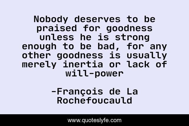 This page presents the quote "Nobody deserves to be praised for goodness unless he is strong enough to be bad, for any other goodness is usually merely inertia or lack of will-power". Author of this quote is François de La Rochefoucauld. .