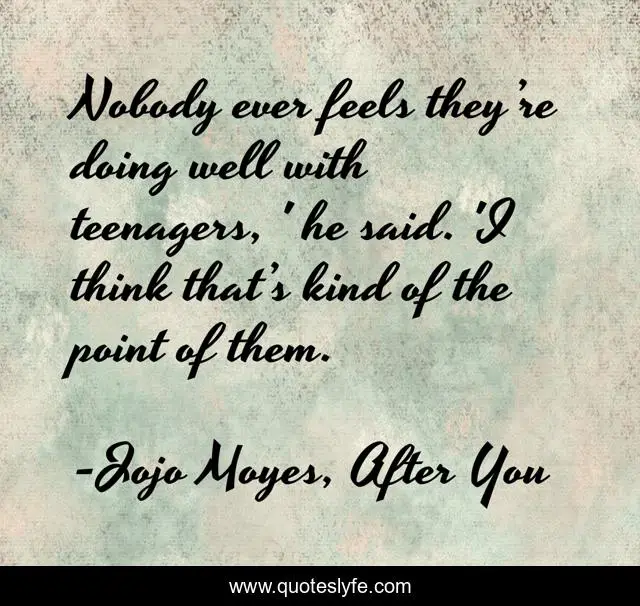 This page presents the quote "Nobody ever feels they’re doing well with teenagers, ' he said. 'I think that’s kind of the point of them.". Author of this quote is Jojo Moyes, After You. .