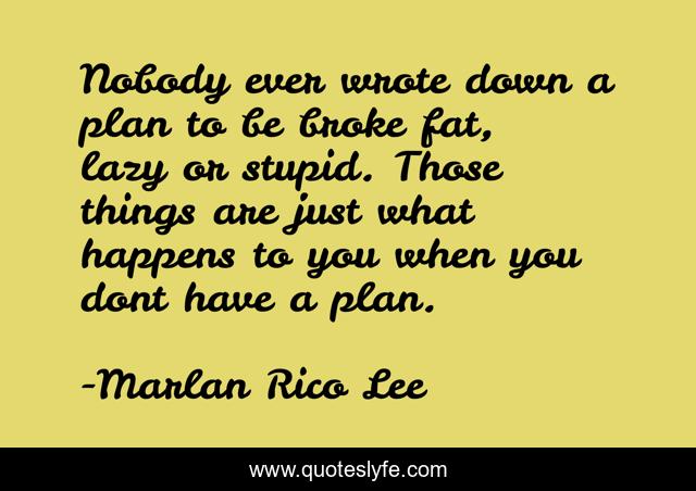 This page presents the quote "Nobody ever wrote down a plan to be broke fat, lazy or stupid. Those things are just what happens to you when you dont have a plan.". Author of this quote is Marlan Rico Lee. This quote is about stupidity, planning, broke,.