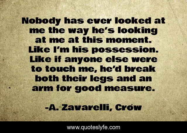 This page presents the quote "Nobody has ever looked at me the way he’s looking at me at this moment. Like I’m his possession. Like if anyone else were to touch me, he’d break both their legs and an arm for good measure.". Author of this quote is A. Zavarelli, Crow. This quote is about possession, love, crow, attraction, mafia-romance, affection,.