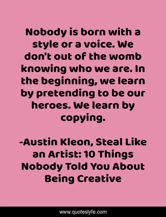 This page presents the quote "Nobody is born with a style or a voice. We don't out of the womb knowing who we are. In the beginning, we learn by pretending to be our heroes. We learn by copying.". Author of this quote is Austin Kleon, Steal Like an Artist: 10 Things Nobody Told You About Being Creative. This quote is about inspriational, creation, creativity, thought-provoking, inspirational, enthusiasm, thoughts,.