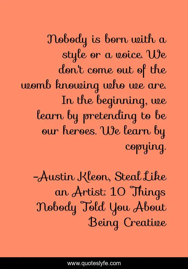 This page presents the quote "Nobody is born with a style or a voice. We don't come out of the womb knowing who we are. In the beginning, we learn by pretending to be our heroes. We learn by copying.". Author of this quote is Austin Kleon, Steal Like an Artist: 10 Things Nobody Told You About Being Creative. This quote is about austin-kleon, style, voice, steal-like-an-artist, copying,.