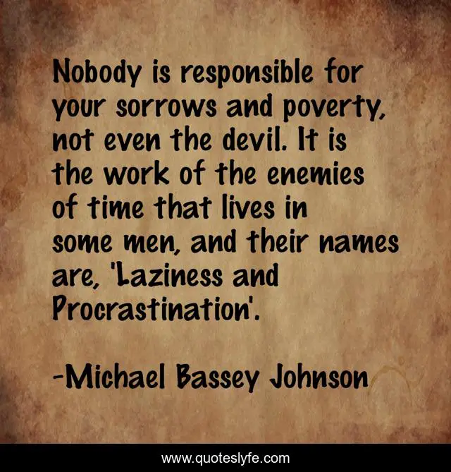 Nobody is responsible for your sorrows and poverty, not even the devil. It is the work of the enemies of time that lives in some men, and their names are, 'Laziness and Procrastination'.