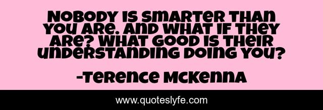 This page presents the quote "Nobody is smarter than you are. And what if they are? What good is their understanding doing you?". Author of this quote is Terence McKenna. This quote is about knowledge, smart, understanding,.