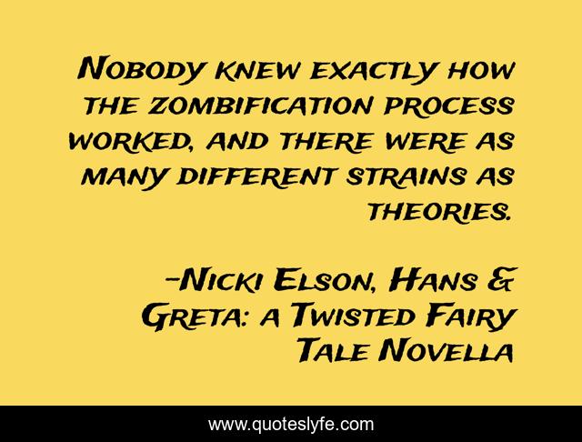 This page presents the quote "Nobody knew exactly how the zombification process worked, and there were as many different strains as theories.". Author of this quote is Nicki Elson, Hans & Greta: a Twisted Fairy Tale Novella. This quote is about zombie, twisted-fairy-tales, adult-fairy-tales, zombies,.