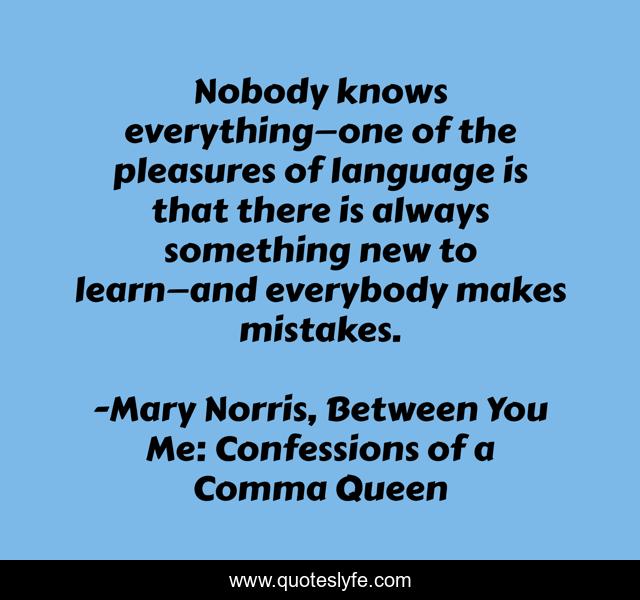 This page presents the quote "Nobody knows everything—one of the pleasures of language is that there is always something new to learn—and everybody makes mistakes.". Author of this quote is Mary Norris, Between You Me: Confessions of a Comma Queen. .
