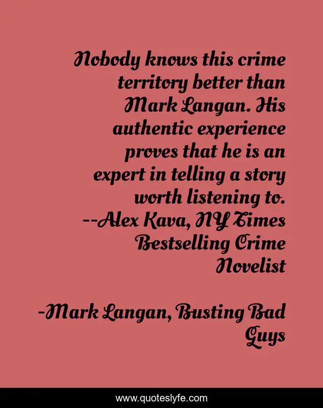 This page presents the quote "Nobody knows this crime territory better than Mark Langan. His authentic experience proves that he is an expert in telling a story worth listening to. --Alex Kava, NY Times Bestselling Crime Novelist". Author of this quote is Mark Langan, Busting Bad Guys. This quote is about alex-kava, nonfiction, crime,.
