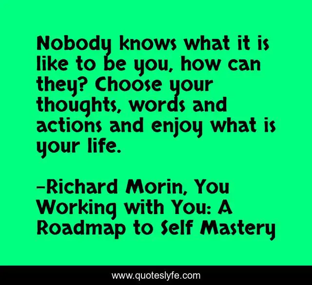 This page presents the quote "Nobody knows what it is like to be you, how can they? Choose your thoughts, words and actions and enjoy what is your life.". Author of this quote is Richard Morin, You Working with You: A Roadmap to Self Mastery. This quote is about enthusiasm, confidence, inspirational, reality,.