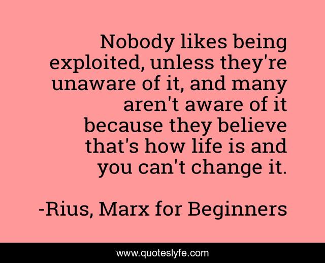 This page presents the quote "Nobody likes being exploited, unless they're unaware of it, and many aren't aware of it because they believe that's how life is and you can't change it.". Author of this quote is Rius, Marx for Beginners. This quote is about exploitation, ignorance,.