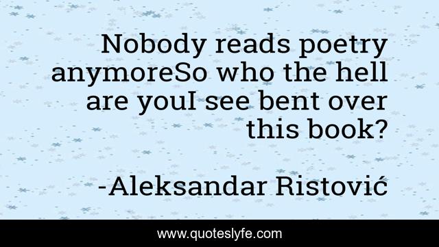 This page presents the quote "Nobody reads poetry anymoreSo who the hell are youI see bent over this book?". Author of this quote is Aleksandar Ristović. This quote is about serbian-poetry, poetry,.