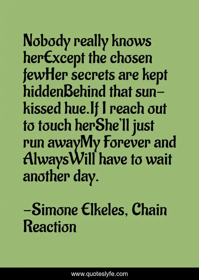 This page presents the quote "Nobody really knows herExcept the chosen fewHer secrets are kept hiddenBehind that sun-kissed hue.If I reach out to touch herShe’ll just run awayMy Forever and AlwaysWill have to wait another day.". Author of this quote is Simone Elkeles, Chain Reaction. This quote is about luis, nikki, love, affection, poem,.