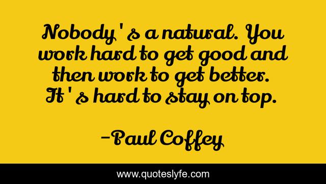 This page presents the quote "Nobody's a natural. You work hard to get good and then work to get better. It's hard to stay on top.". Author of this quote is Paul Coffey. This quote is about top, hard-work,.