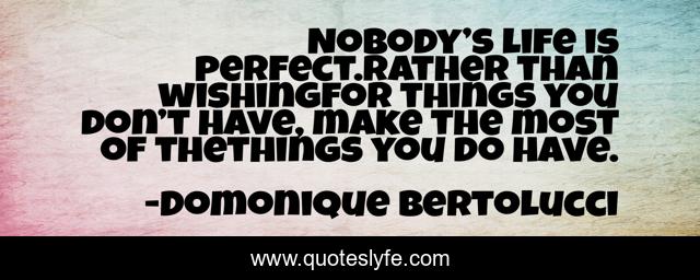 This page presents the quote "Nobody’s life is perfect.Rather than wishingfor things you don’t have, make the most of thethings you do have.". Author of this quote is Domonique Bertolucci. This quote is about life-coaching, motivation, how-to-be-happier, life-coach, be-happy, how-to-be-happy, happiness-advice, happiness, be-more-motivated,.