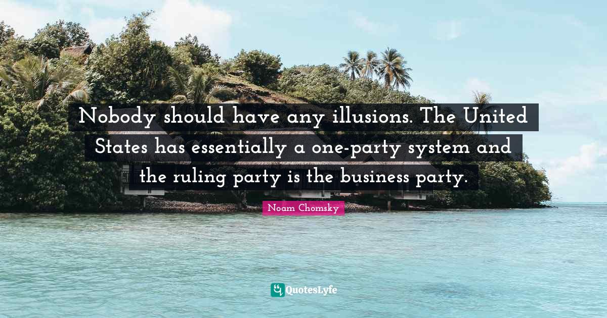 This page presents the quote "Nobody should have any illusions. The United States has essentially a one-party system and the ruling party is the business party.". Author of this quote is Noam Chomsky. This quote is about party, united states, ruling, business, should have,.