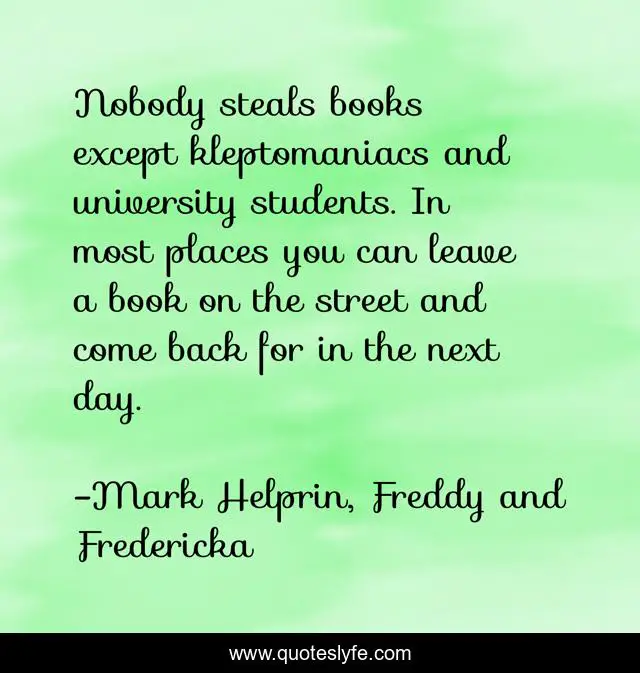 This page presents the quote "Nobody steals books except kleptomaniacs and university students. In most places you can leave a book on the street and come back for in the next day.". Author of this quote is Mark Helprin, Freddy and Fredericka. This quote is about books, reading, theft, bookstores,.